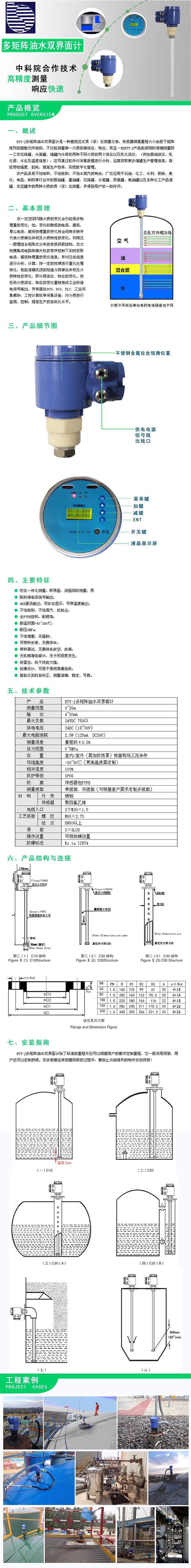 BTY-J多矩陣油水雙界面計(jì)是一種磁感應(yīng)式界(液)位測量儀表,傳感器根據(jù)量程大小由若干矩陣排列的磁敏元件組成,不僅能測量單一介質(zhì)的單液位、物位,而且一臺(tái)BTY-J產(chǎn)品能夠同時(shí)準(zhǔn)確測量同一工作沉降罐、分離罐、儲(chǔ)罐內(nèi)分層的兩種不同介質(zhì)的兩個(gè)液位以及乳化液位,(例如原油液位、乳化層、水位及溫度信息),還可通過軟件對采集數(shù)據(jù)進(jìn)行分析、運(yùn)算獲取更多儲(chǔ)罐生產(chǎn)管理信息,降低勞動(dòng)強(qiáng)度、能耗,提高生產(chǎn)效率,實(shí)現(xiàn)數(shù)字化管理。 該產(chǎn)品具有不怕掛料、不怕粘附、不怕水蒸汽的特點(diǎn),廣泛應(yīng)用于石油、化工、水利、鋼鐵、焦化、食品、制藥等行業(yè)中的原油罐、重油罐、沉降罐、分離罐、瀝青罐、焦油罐以及各種化工產(chǎn)品儲(chǔ)罐、反應(yīng)罐中的兩種介質(zhì)的界(液)位測量,并得到用戶的一致好評。
